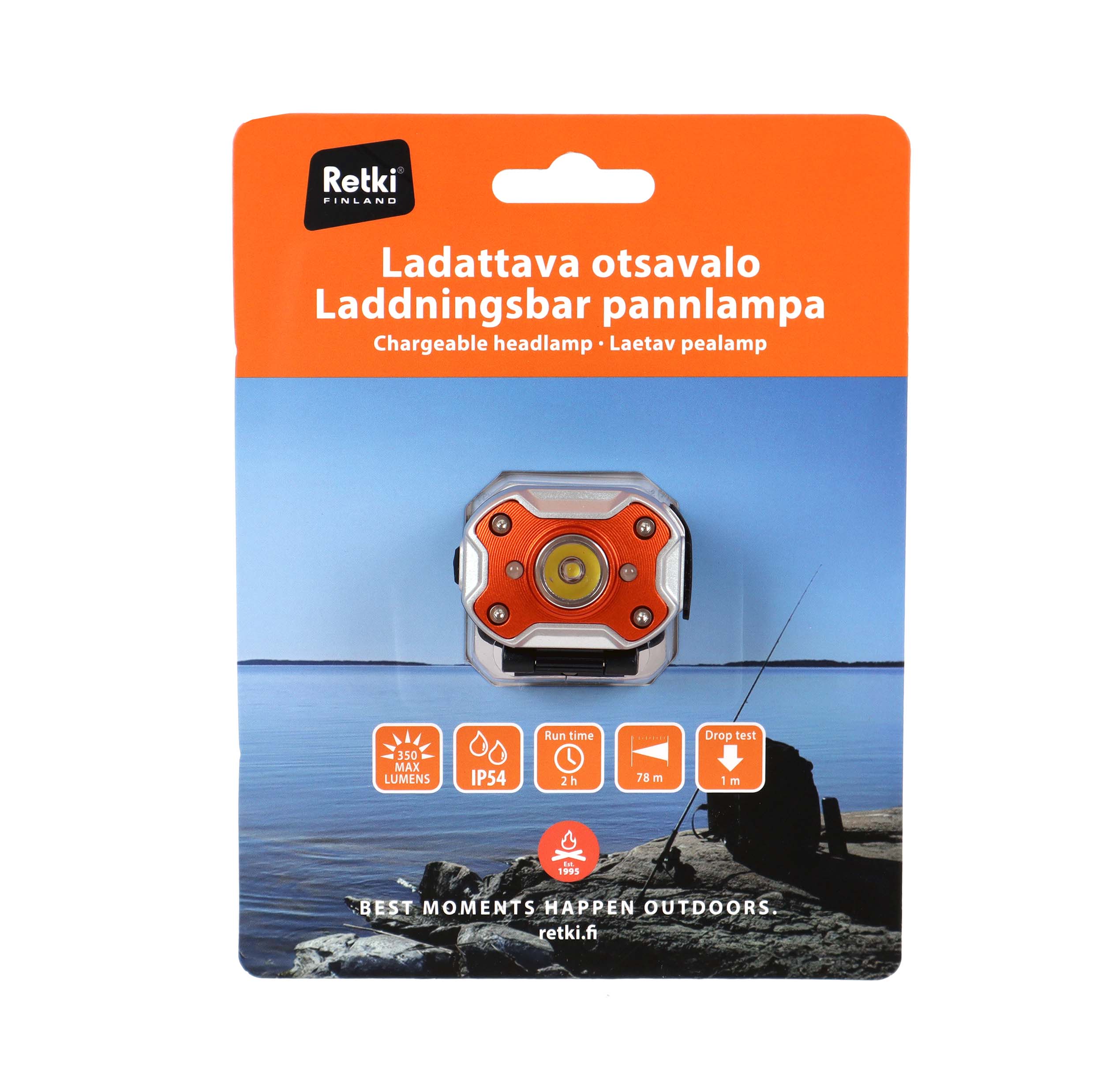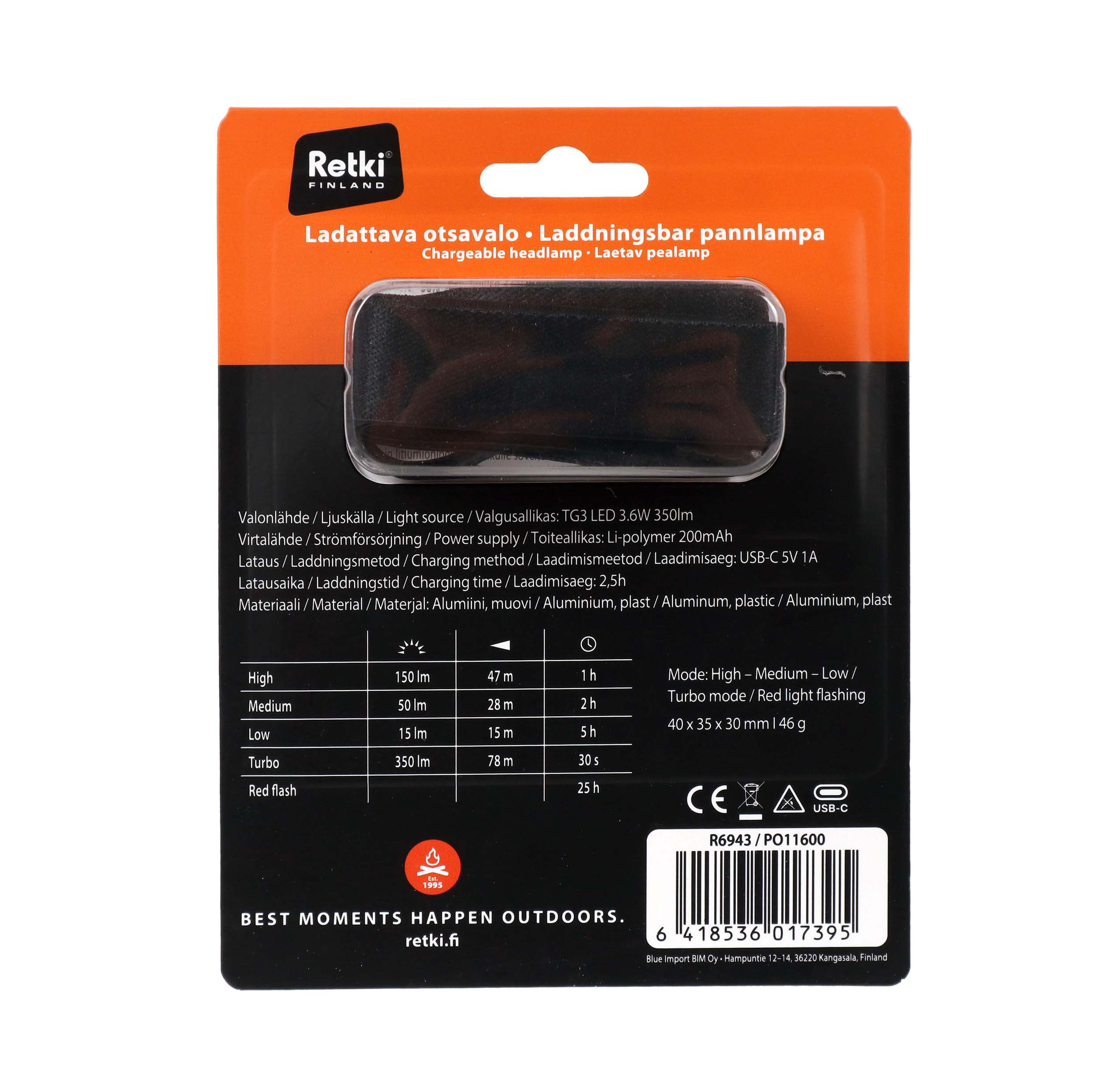 Toiminnot: kirkas 150lm – keskitaso 50lm – himmeä – turbo 350lm – punainen vilkkuva