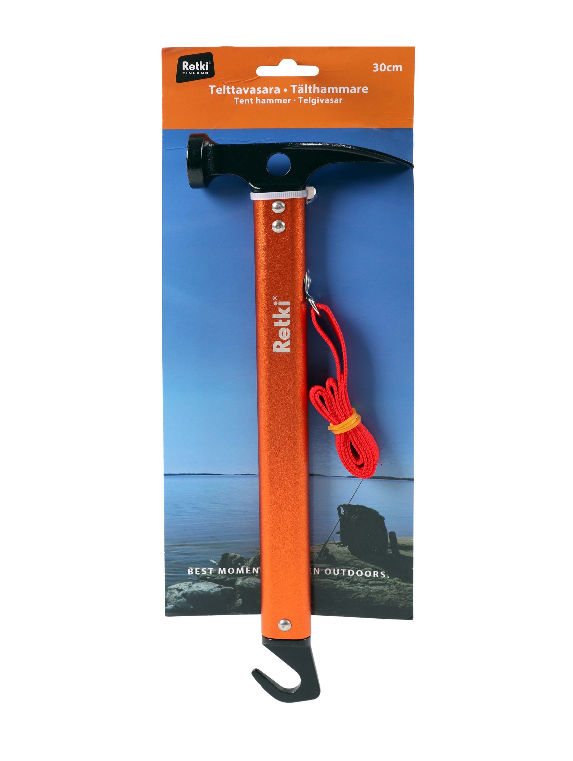 Kestävä telttavasara retkeilyyn ja campingiin. Alumiini–teräsrakenne, koukkupää kiilojen irrotukseen ja huomiovärinen kahva. Pituus 30 cm.