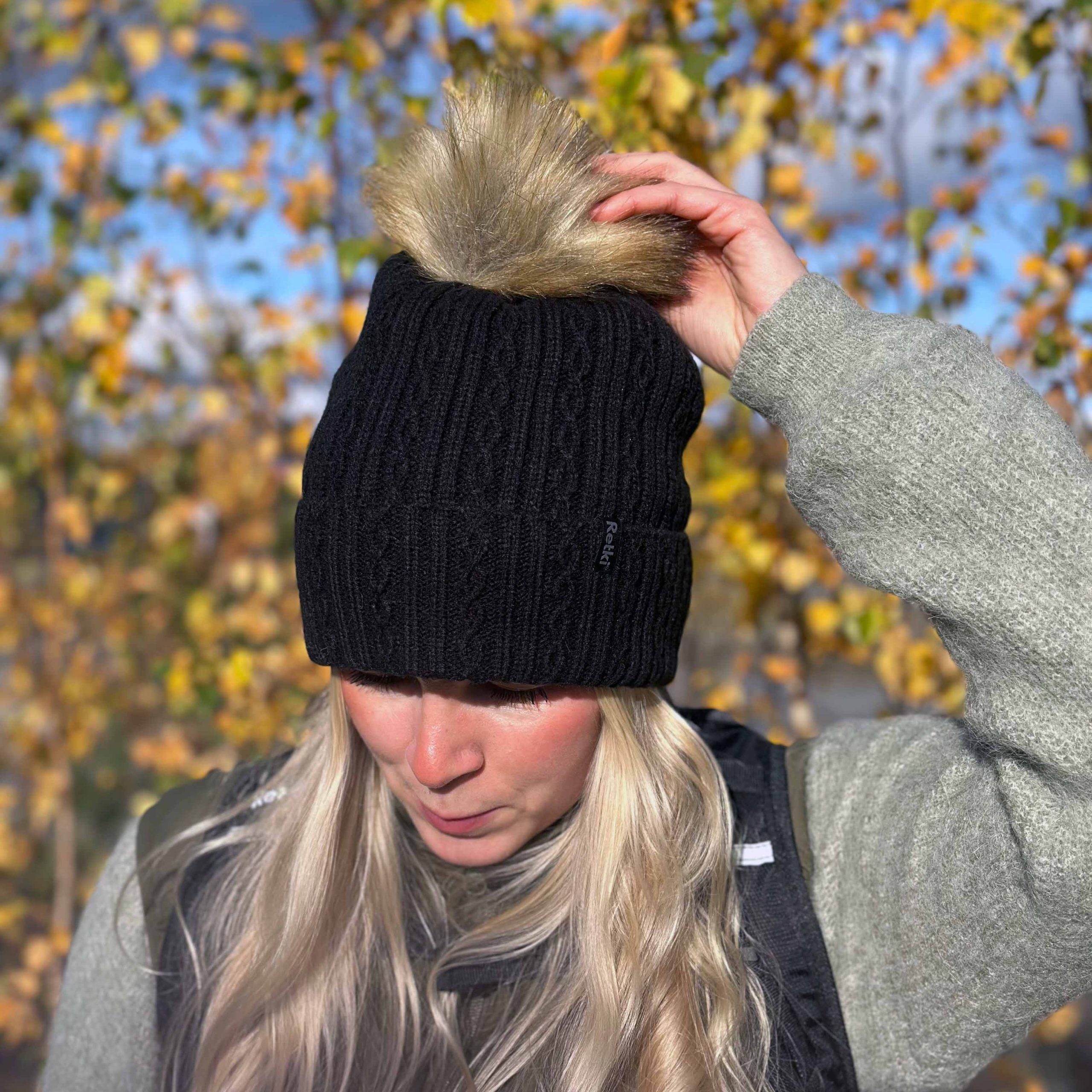 UUTUUS! Musta palmikkoneulepipo tekoturkistupsulla.